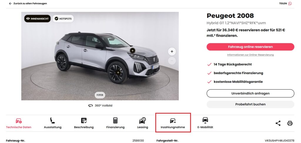 Da Kunden im Fahrzeugshop zahlreiche Eingabemöglichkeiten haben, beeinflussen deren Angaben den ermittelten Preis maßgeblich. Daher empfehlen wir, jede berechnete Inzahlungnahme sorgfältig zu überprüfen und den Preis bei Bedarf anzupassen.