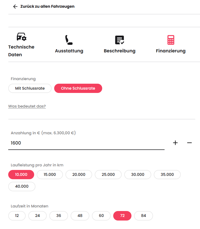 Die Voreinstellungen und Auswahlmöglichkeiten der Finanzierungs- und Leasingrechner der Fahrzeug-Detailseiten sind konfigurierbar. Somit können Sie beispielsweise lediglich gewisse Produkte oder Laufzeiten für ein Kreditinstitut Ihren Kunden zur Verfügung stellen.